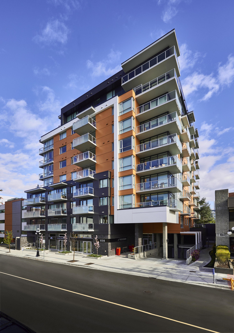 Escher is a ten-storey mixed-use residential development located at 838 Broughton Street in Victoria. Thoughtfully designed to support modern downtown living, the project combines contemporary homes with street-level retail in a highly walkable urban setting.